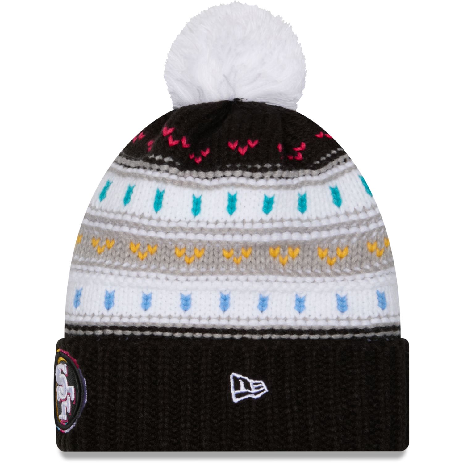 This warm knit beanie with embroidered team logo, NFL Shield, and colorful pattern combines comfort and style for cold days.