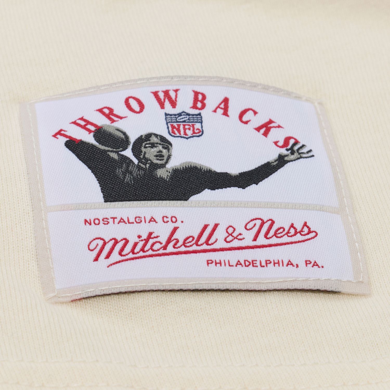 The cream-colored top showcases authentic vintage-style graphics and embroidered patches on the front and sleeves, giving it a nostalgic sportswear look.