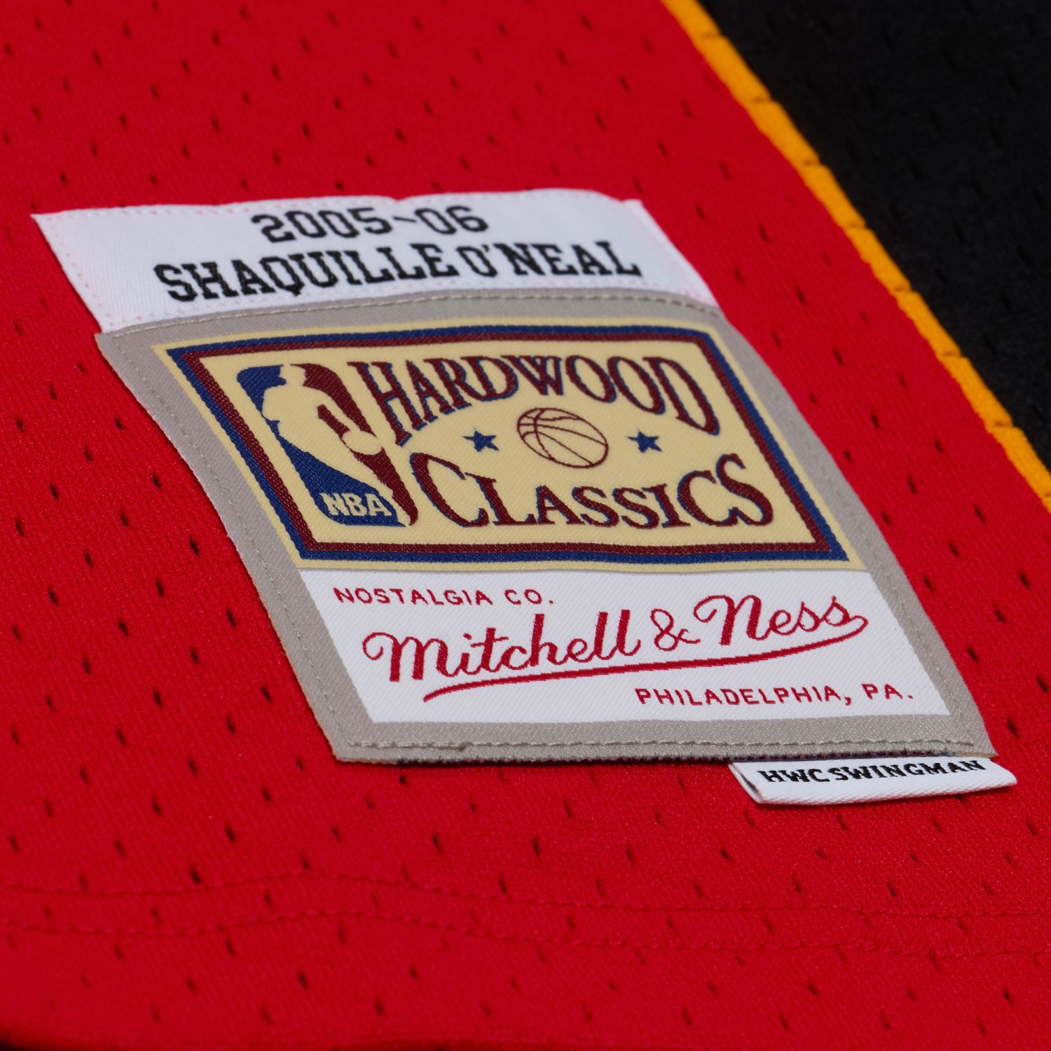 Mitchell & Ness HWC Swingman woven jocktag and woven label player name/year ID at lower left front.
