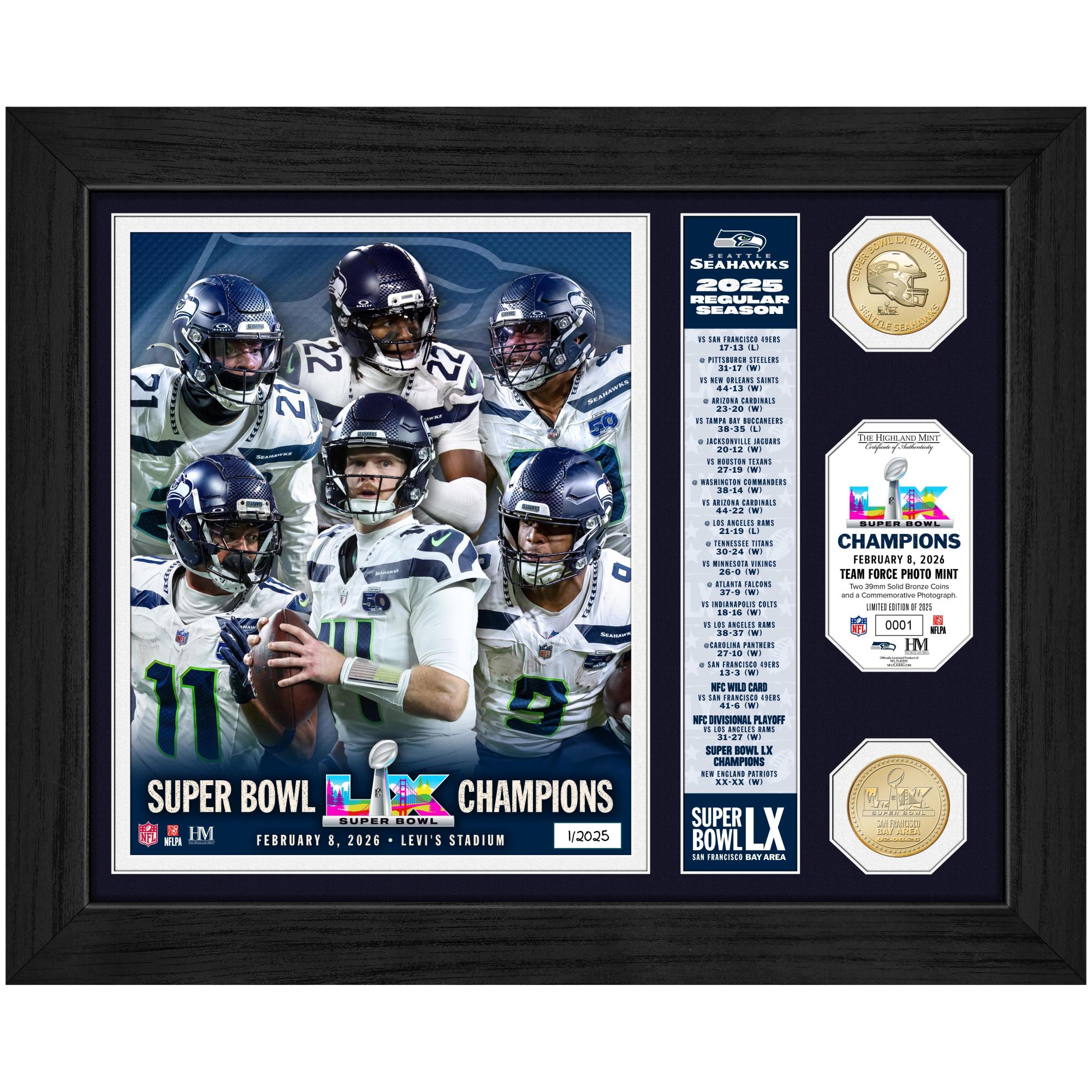 Ce collector encadré en édition limitée célèbre les Seattle Seahawks, champions du Super Bowl LX, et met en valeur les victoires clés qui ont mené au titre.