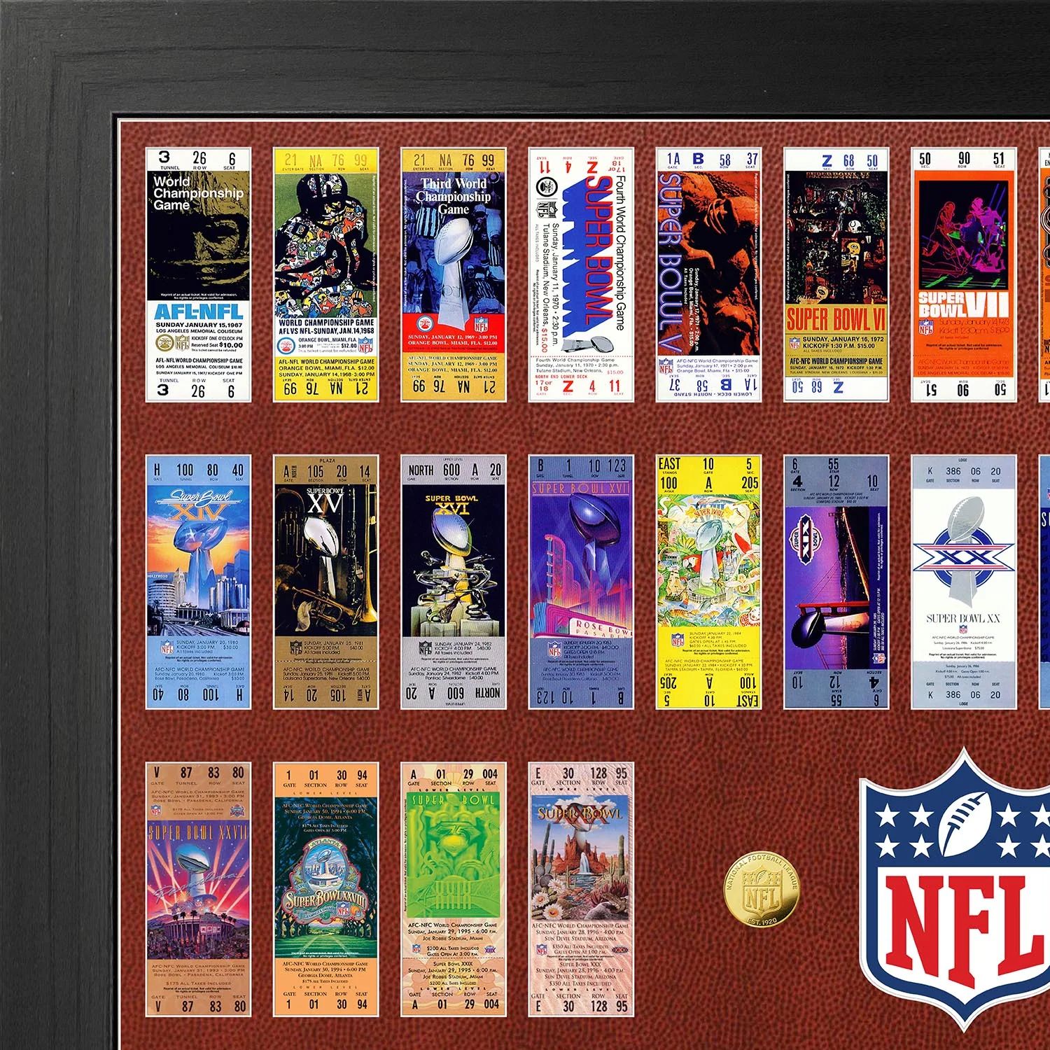 Sous verre acrylique, le passe partout à l’aspect football texturé apporte une finition premium, et l’ensemble met en valeur des répliques de billets des 60 Super Bowls.
