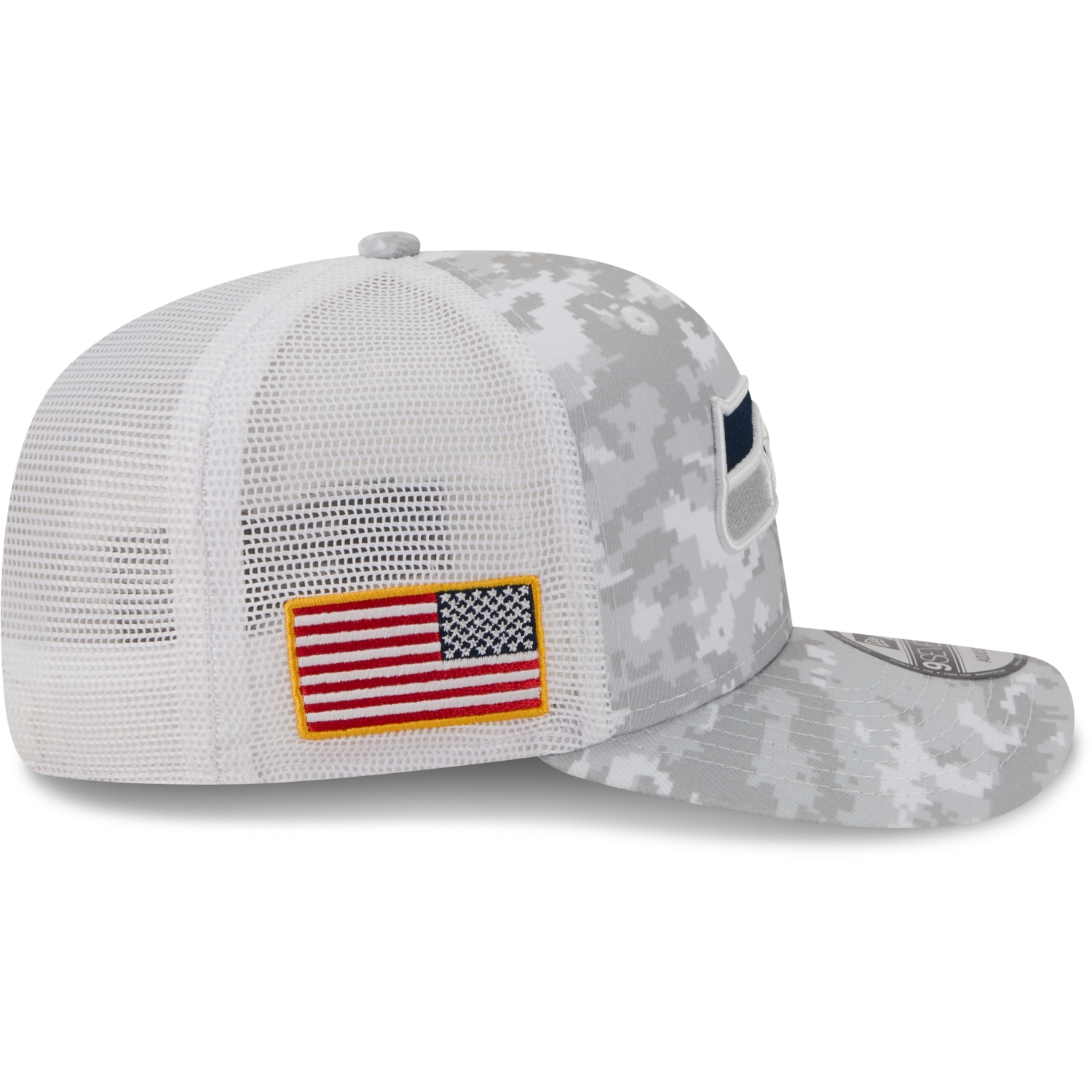 Auf der Vorderseite zeigt sich das aufwendig gestickte Teamlogo, seitlich ist die US-Flagge angebracht, und auf der Rückseite befindet sich das gestickte New Era Salute to Service-Logo – ein Symbol für Teamspirit, Respekt und Zusammenhalt.
